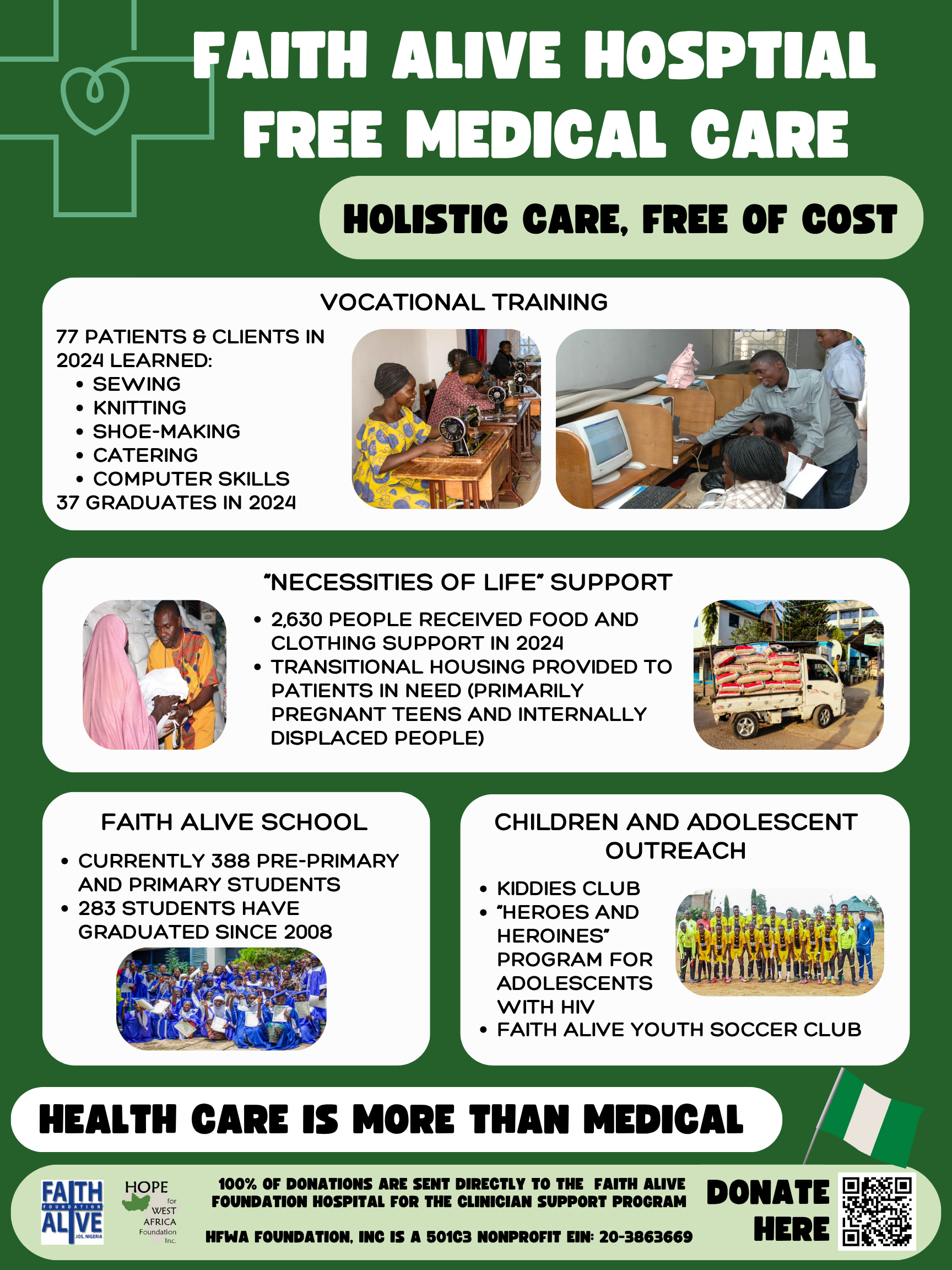 Though Faith Alive has expanded into a full-scale hospital offering expert medical services, its team remains deeply committed to meeting the holistic needs of every patient. Vocational training programs, such as sewing, knitting, shoe-making, catering, and computer literacy, equip patients with valuable skills. Those in need are provided with transitional housing, food, and clothing. Faith Alive also operates a free school for neighborhood children, in combination with many other neighborhood supports.
